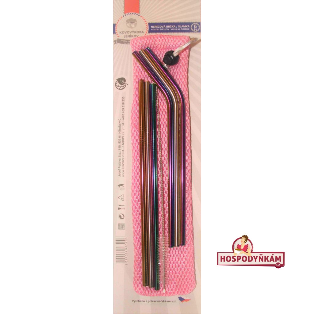 2x zahnuté brčko duhové, 2x rovné brčko duhové, 1x rovné brčko stříbrné, 1x zahnuté brčko stříbrné, 1x čistící kartáček, 1x růžový sáček pro uskladnění brček
