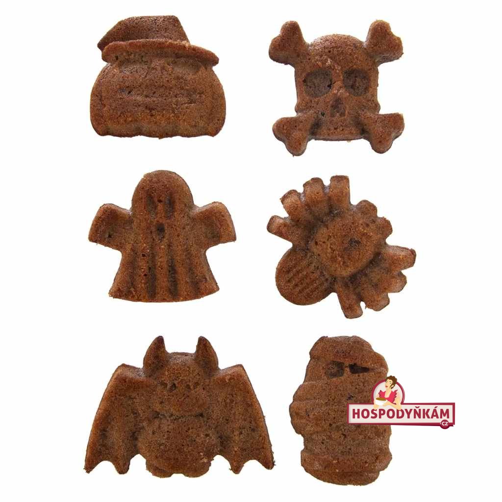 Nepřilnavá silikonová forma HALLOWEEN je skvělým pomocníkem pro pečení 6 nadýchaných muffinů ve strašidelných tvarech, ale také pro přípravu ovocné dřeně, domácího müsli, panna cotty nebo smetanových dezertů. Forma obsahuje motivy dýně, lebky, ducha, pavouka, netopýra a mumie. Každý tvar má velikost cca 7 × 6 cm.