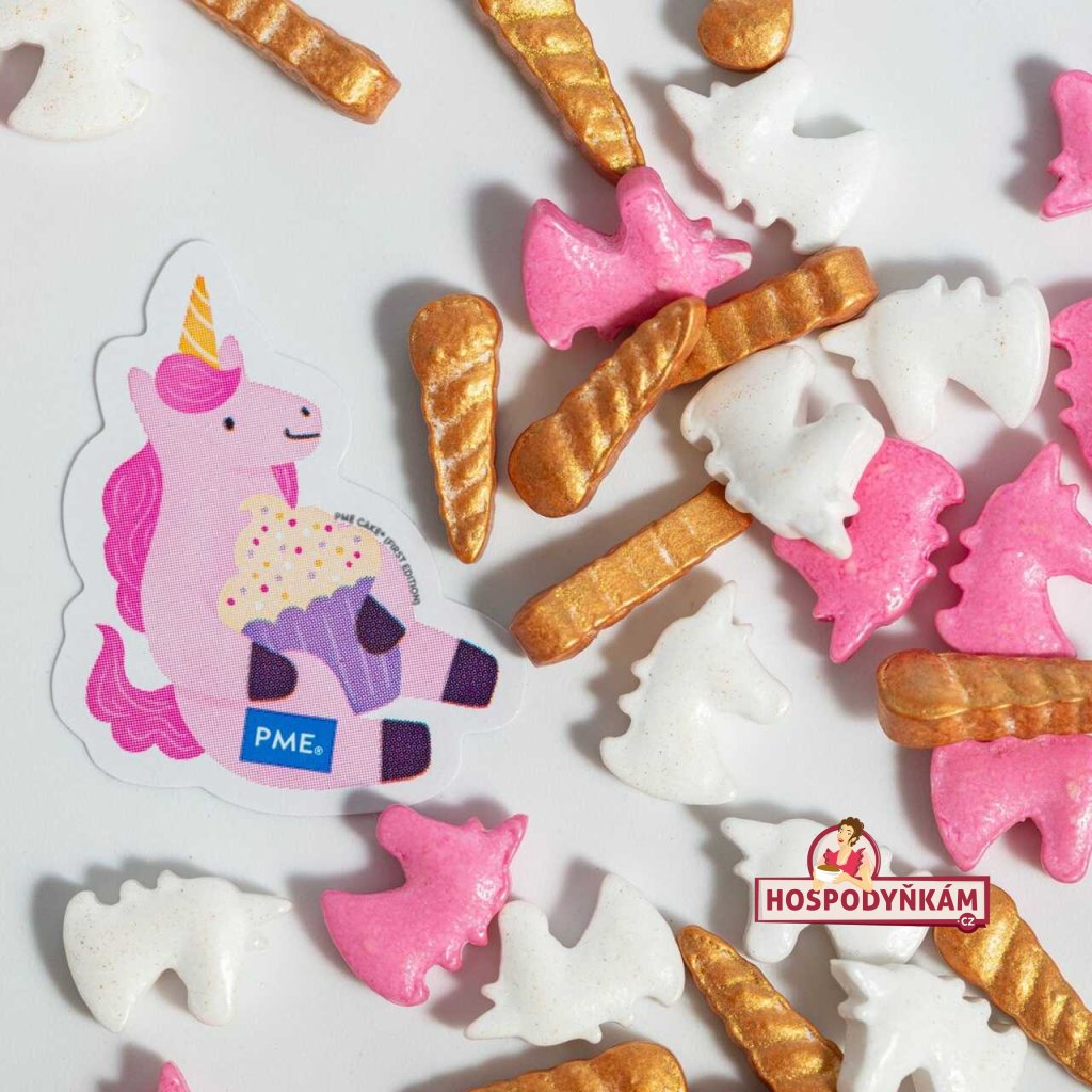 Pro kouzelný a pohádkový vzhled vašich cukrářských výtvorů vyzkoušejte tvarované cukrářské zdobení PME Jednorožci. Balení obsahuje drobné dekorace ve tvaru růžových a bílých hlav jednorožců doplněné o zlaté jednorožčí rohy. Každá dekorace má rozměr přibližně 1,3 × 1 cm, takže je ideální jako jemný detail na dorty, cupcakes, dezerty nebo zmrzlinové poháry.