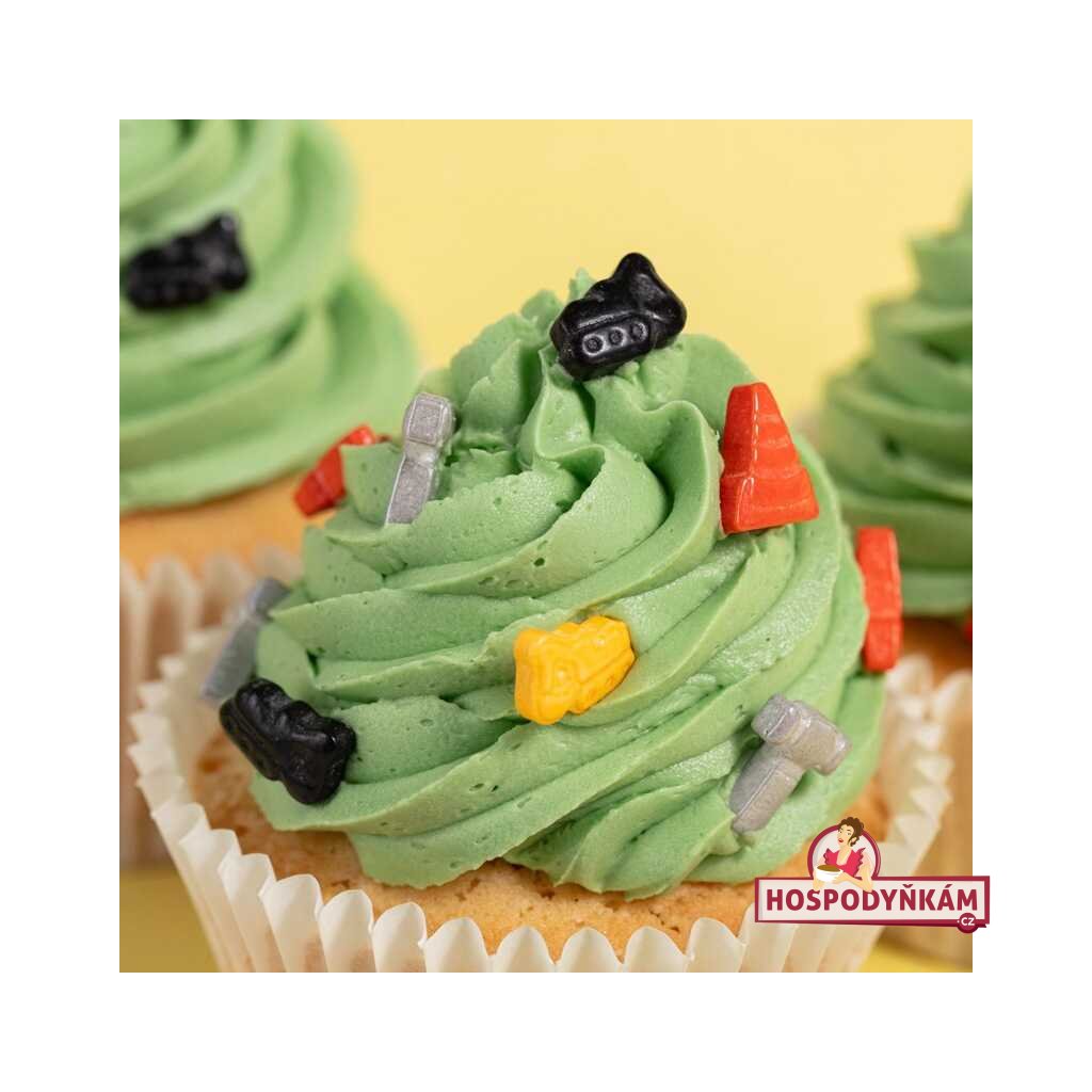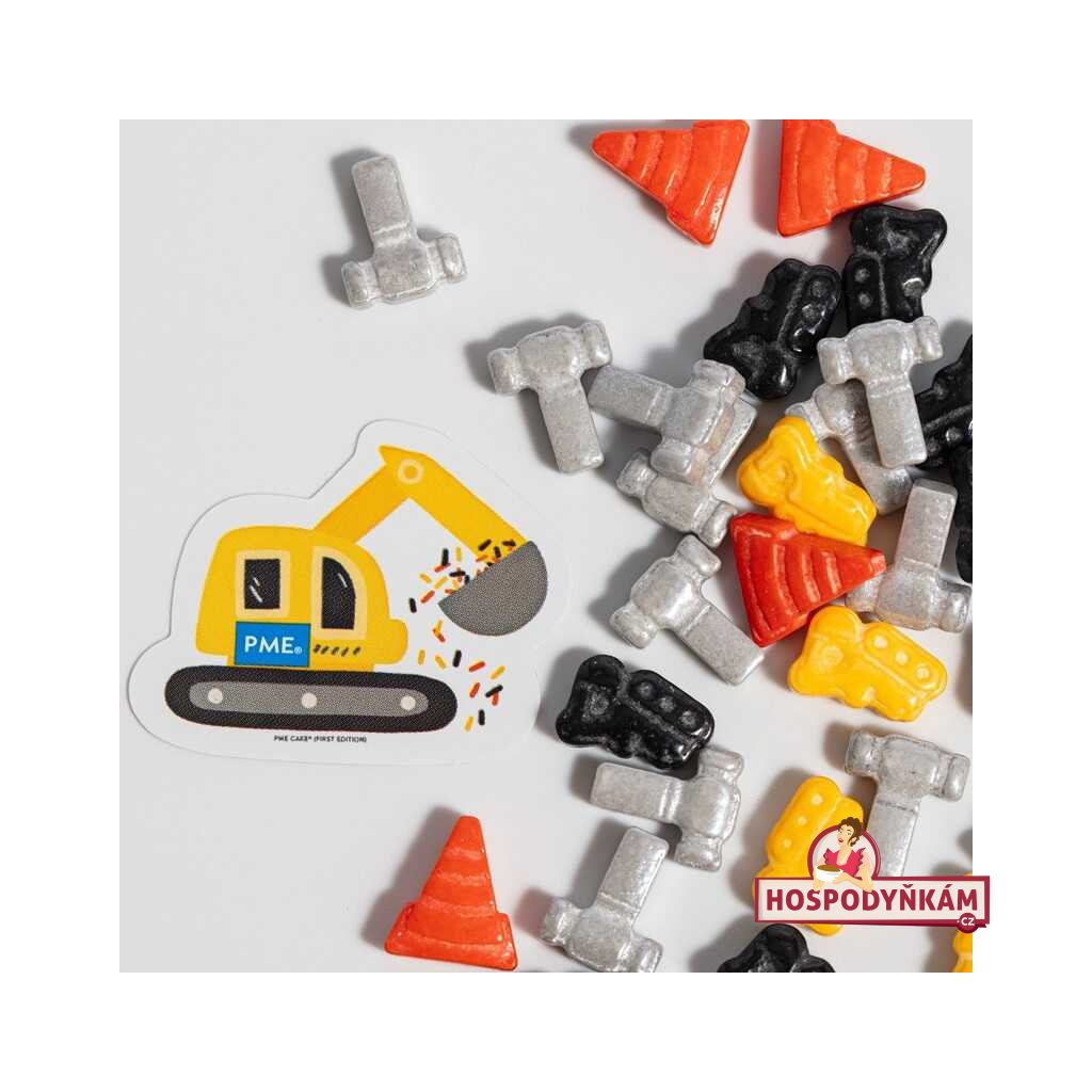 Barevná kombinace oranžových kuželů, stříbrných kladiv a černých a žlutých bagrů dodá vašim sladkostem veselý a hravý vzhled.