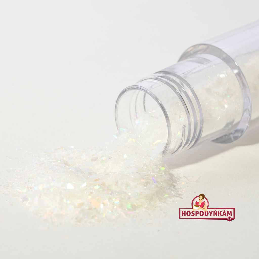 Bílé duhové třpytky v praktické dóze okamžitě promění každý dezert v zářivý klenot. Jemné třpytivé částečky s prizmatickým efektem připomínajícím drahokam dodají dortům, cupcakes, zákuskům i semifredům luxusní vzhled a slavnostní atmosféru. Dekorace je 100% jedlá, veganská a vyrobená z přírodních barviv, takže si ji může vychutnat opravdu každý. Stačí ji jednoduše nasypat na suchý povrch a rázem vytvoříte mistrovské dílo, které zaujme na první pohled.