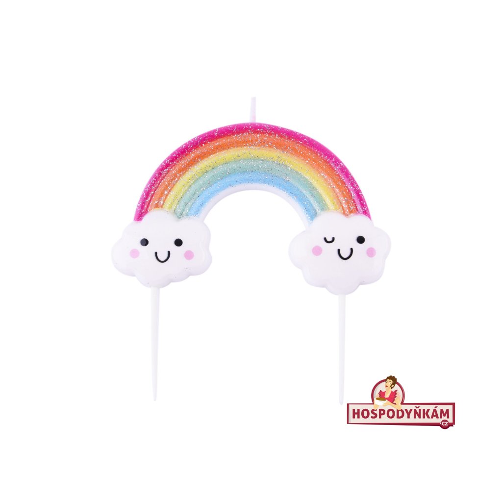 Velká solitérní svíčka vhodná na narozeninové dorty je vyrobena ve tvaru duhy se třpytkami.