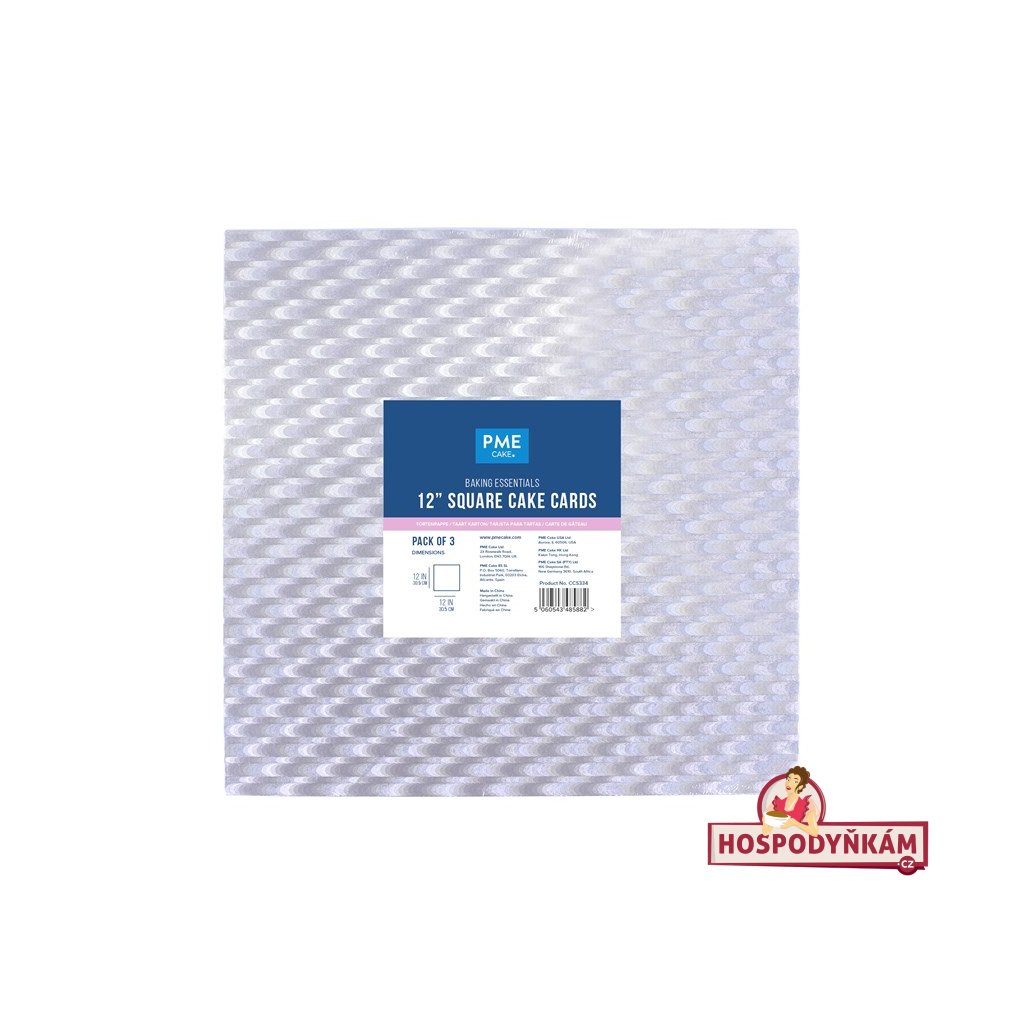 Set tenkých jednostranných čtvercových podložek pod dort s hladkým rovným okrajem a nepromastitelným povrchem ze stříbrné fólie s metalickým efektem.