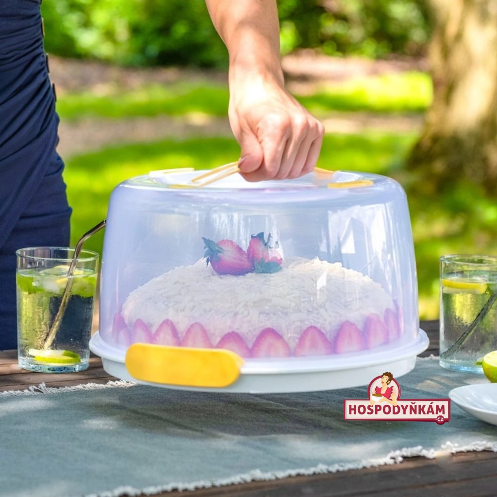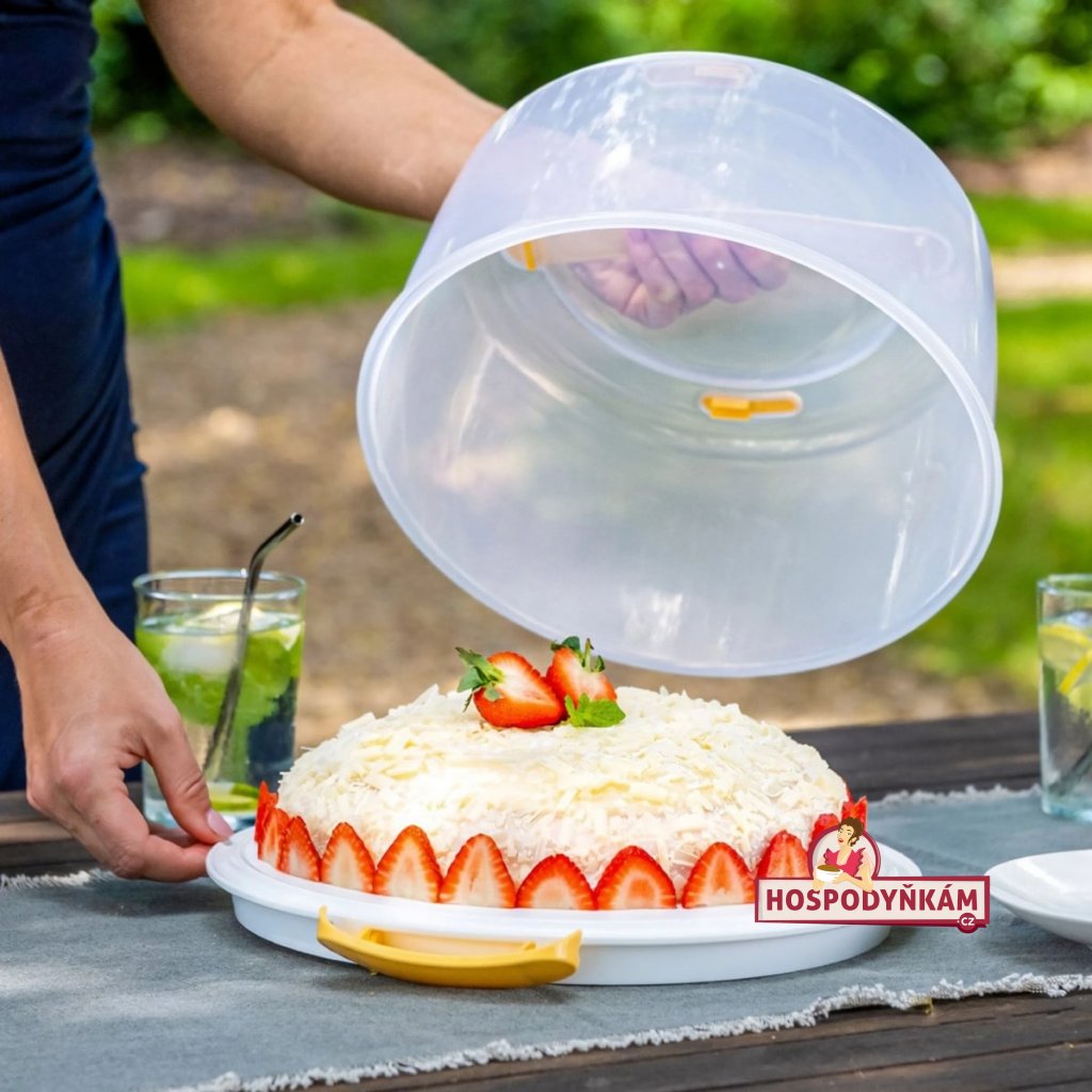 Tescoma přináší plastový podnos s průhledným víkem, který oceníte při přenášení a uchovávání dortů, moučníků nebo chlebíčků. Díky odnímatelnému chladicímu dílu je ideální pro použití v létě – udrží pokrmy chladné i na zahradní party či pikniku. Výrobek je navíc opatřen větracími otvory, které zajišťují optimální proudění vzduchu a zabraňují rosení poklopu. Tento praktický podnos je vhodný pro moučníky až do výšky 13 cm, takže uspokojí všechny milovníky pečení.