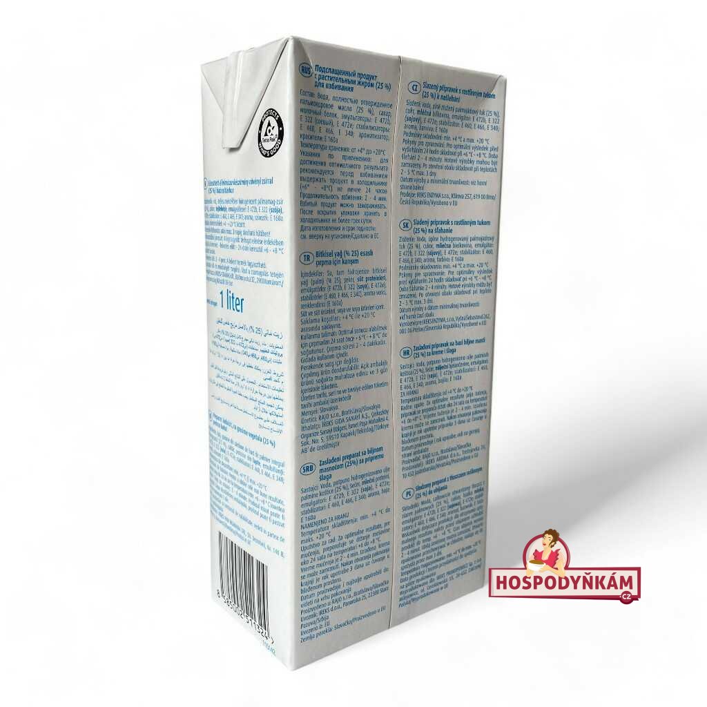 - voda, plně ztužený palmojádrový tuk 25%, cukr, MLÉČNÁ bílkovina, emulgátory (E472b, E322 SÓJOVÝ lecitin, E472e), stabilizátory (E460, E466,E340), aroma, barvivo E160a.