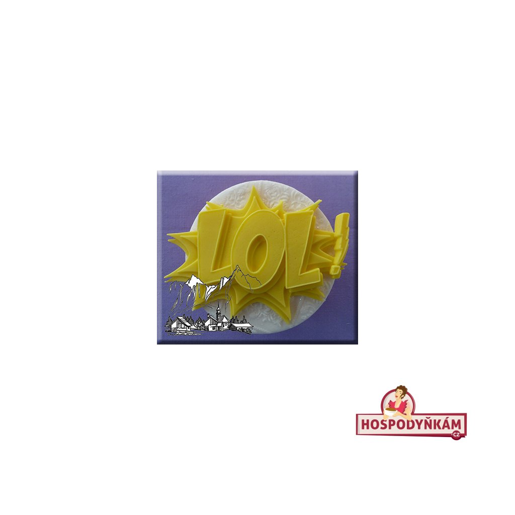Forma na tvarování marcipánu. Hotový výlisek s nápisem LOL!