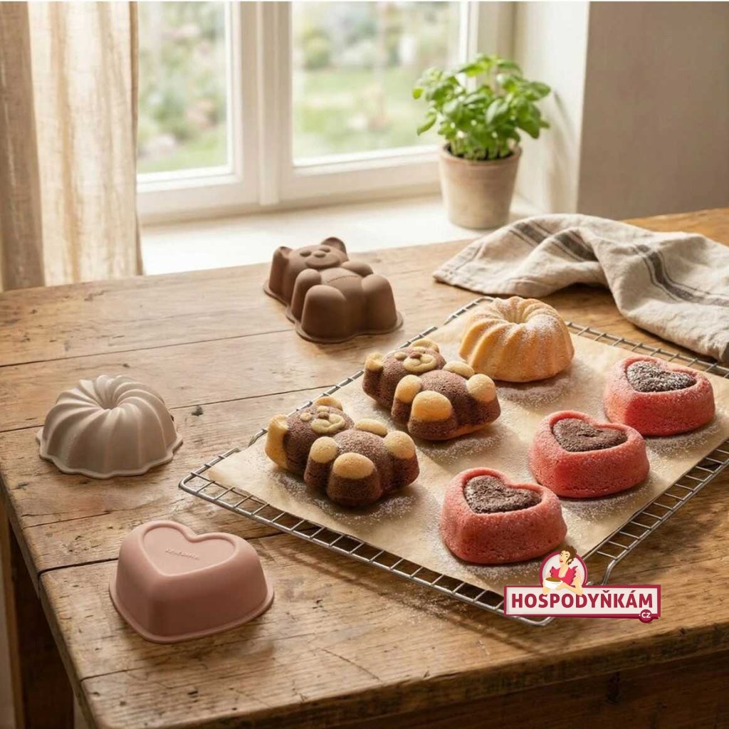 S touto sadou silikonových formiček snadno a rychle připravíte originální pečivo ve třech roztomilých tvarech: medvídek, srdce a bábovička. Formičky jsou ideální pro pečení muffinů, piškotových, ořechových, kakaových, perníkových, red velvet a dalších těst.