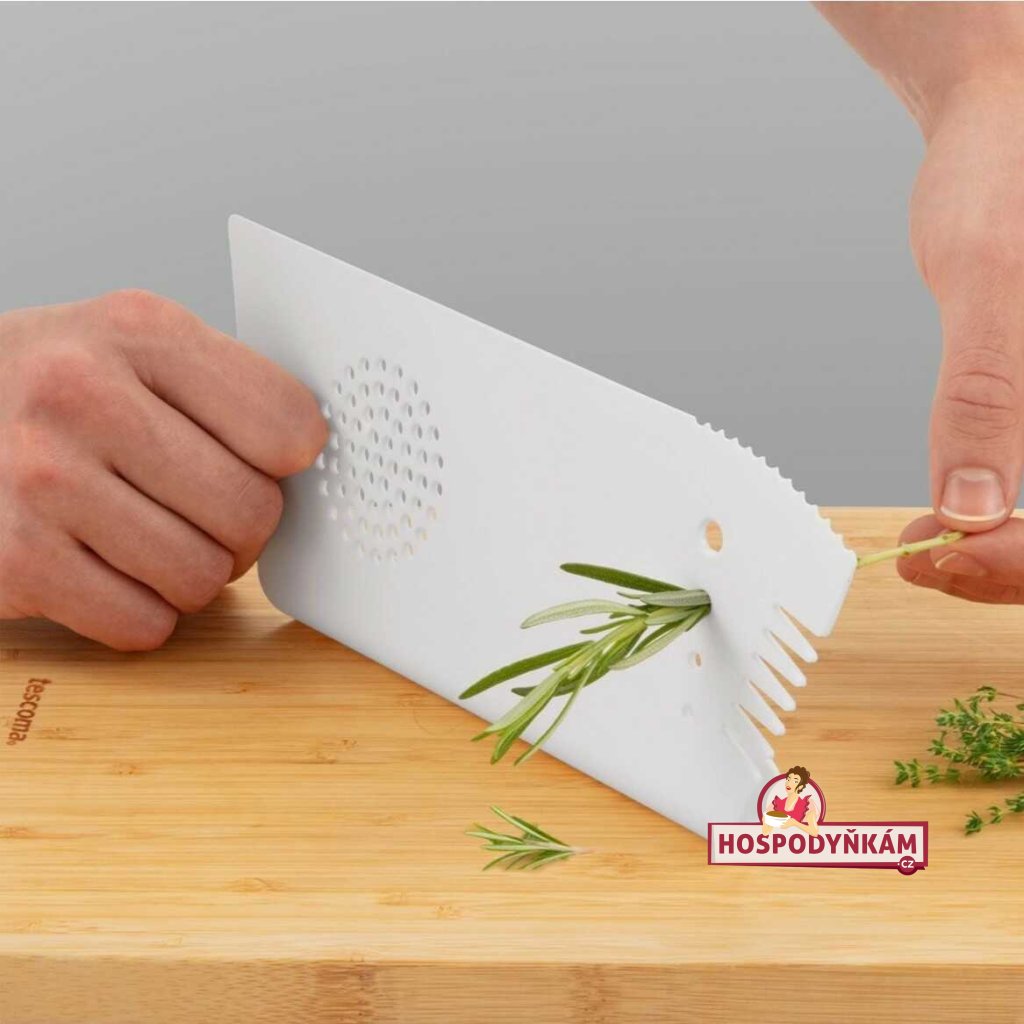 - Separace bylinek: Čtyři různě velké otvory a výkroje na hraně slouží k jednoduchému oddělení lístků bylinek od stonků.