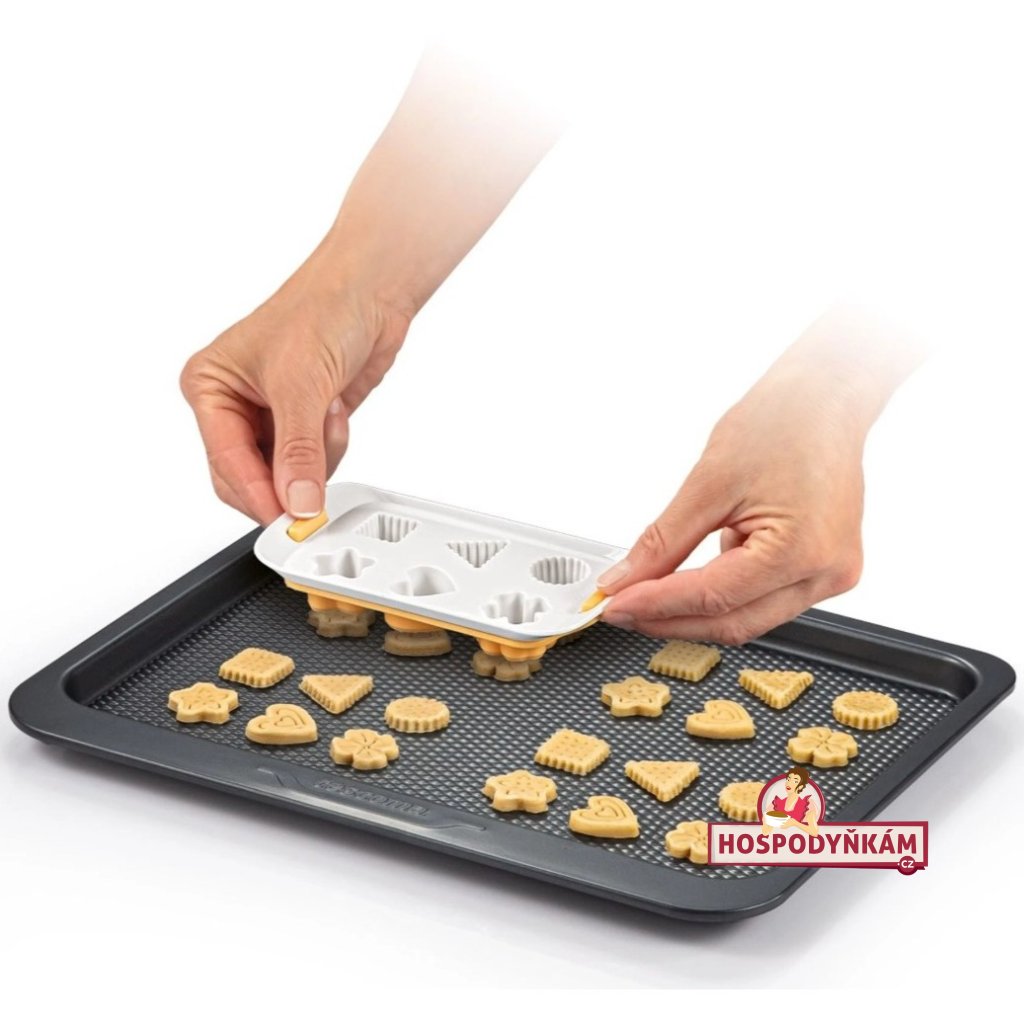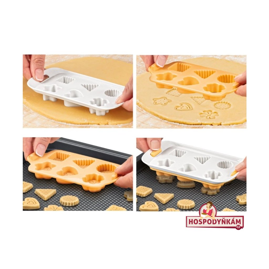 - Vykrojené cukroví pak snadno odeberete z plátu těsta a jedním pohybem je přenesete na plech, kde je vytlačením z formy najednou ideálně rozmístíte pro dokonalé propečení.