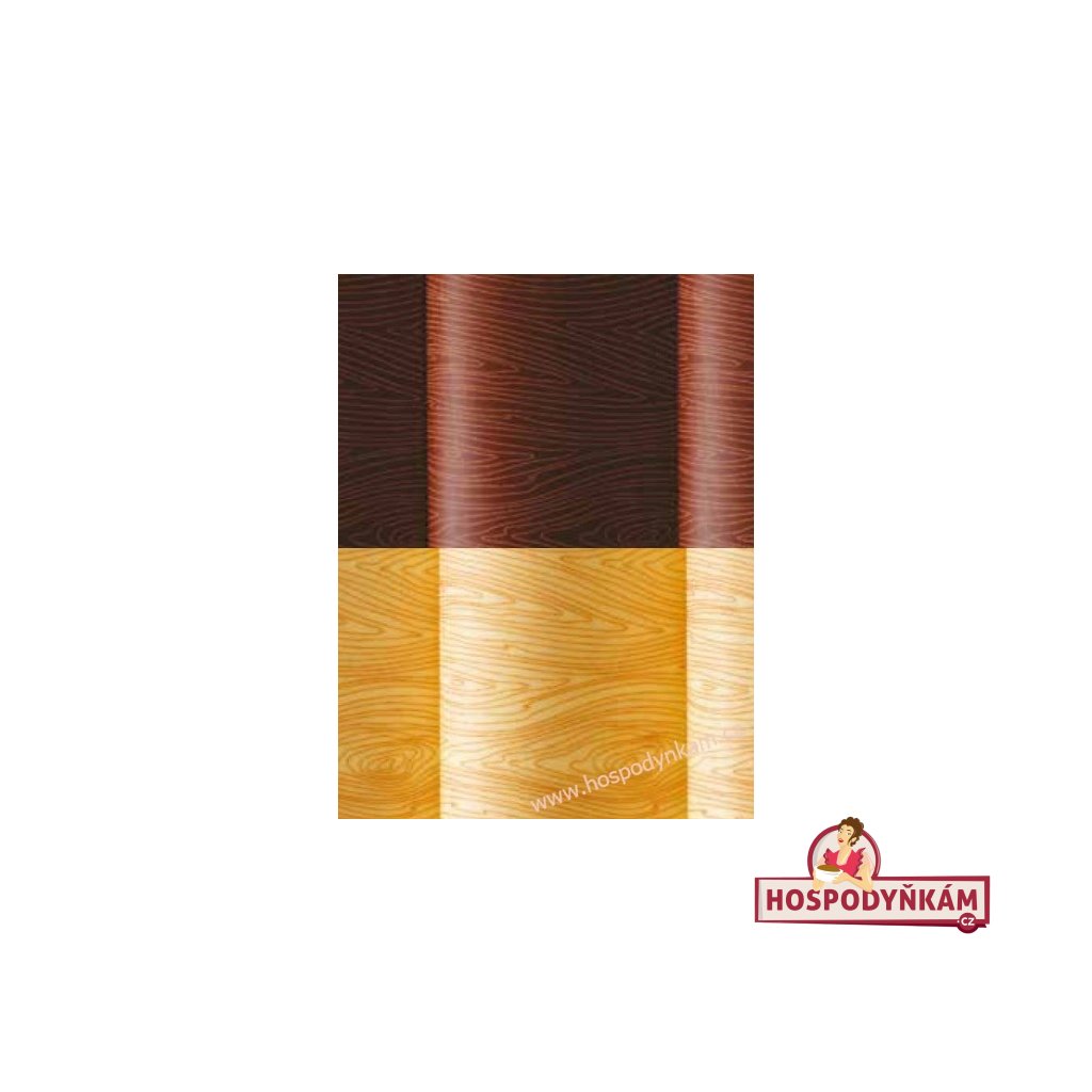 fólii položíme hladkým povrchem na pevnou podložku (pečící plech, prkénko). Hrubý tukový povrch musí být nahoře, na něj se bude nanášet čokoláda. Čokoládu (polevu, cca 220g) rozehřejeme ve vodní lázni při cca 45-50°C - dle druhu polevy a zchladíme občasným mícháním na cca 25°C. Takto vlažnou čokoládu nalijeme na fólii a roztíracím nožem, kartou, apod. rozetřeme. Necháme v lednici zatuhnout. Po zatuhnutí otočíme fólii čokoládou směrem dolů na podložku a opatrně sejmeme fólii - vzorek zůstane na čokoládě. Poté dělím na požadované tvary - nutné je, aby nůž, kterým čokoládu budete řezat, byl horký a suchý, tím se čokoláda nebude lámat. Stačí ho mí namočený v horké vodě a před každým zářezem otřít.