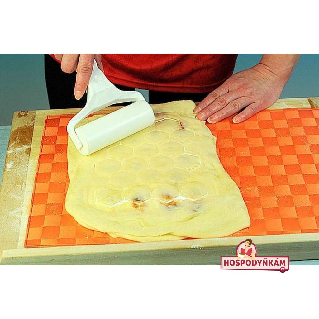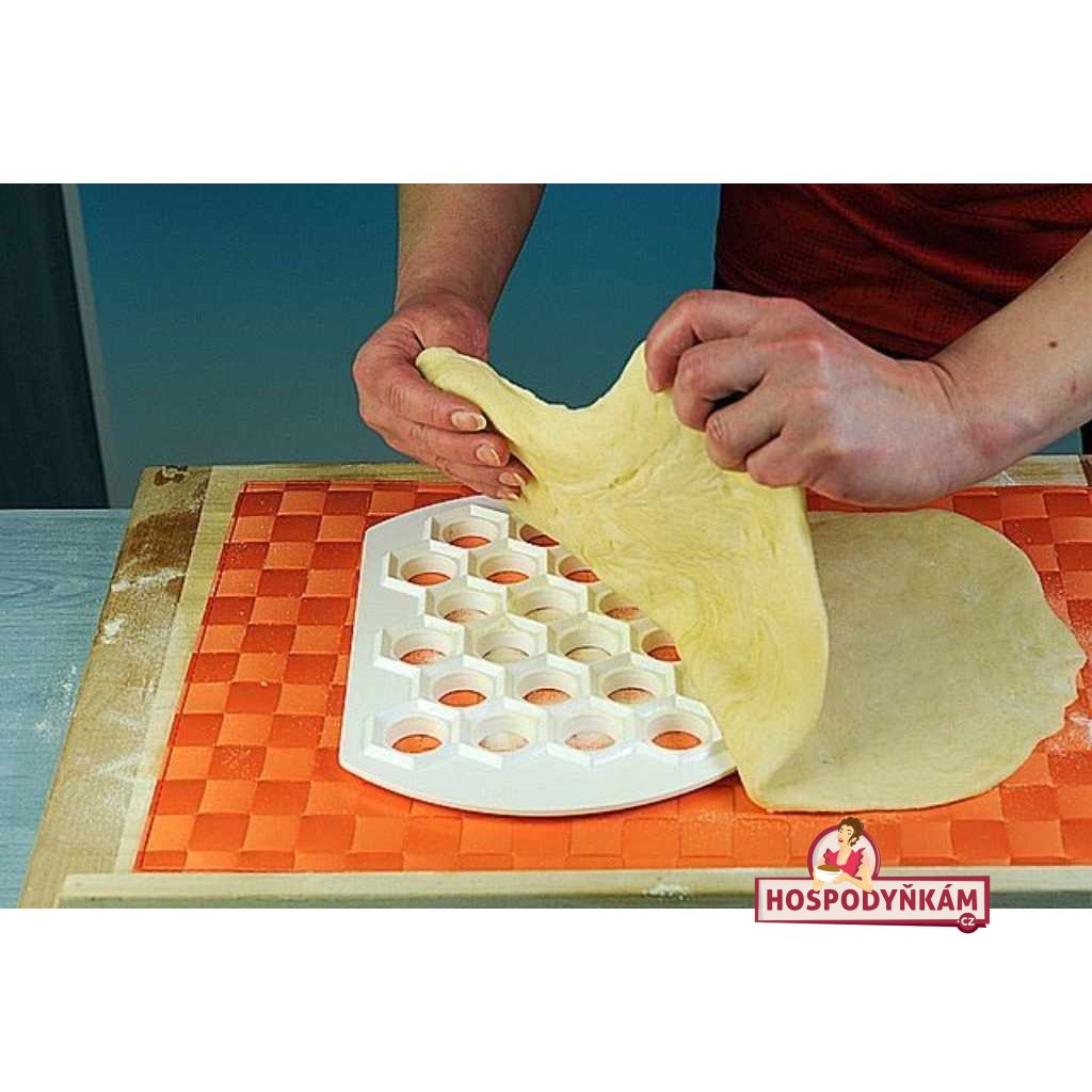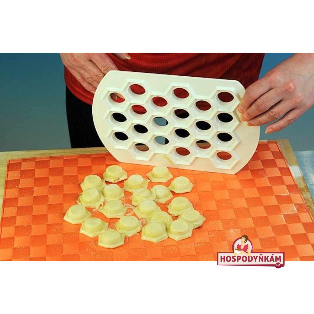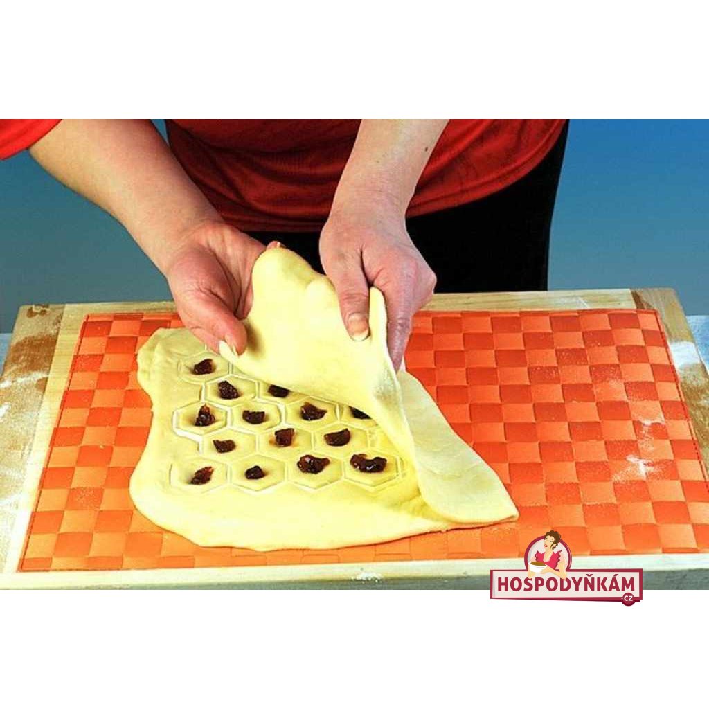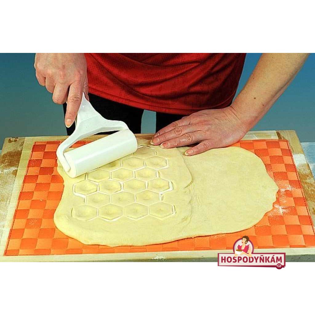 Tvořítko stačí před použitím zlehka posypat moukou, aby se těsto nelepilo. Rozválený plát těsta položíte na tvořítko, lehce přejedete válečkem, aby se zvýraznily jednotlivé plástve, a naplníte vybranou směsí. Přiklopíte druhou částí těsta, opět lehce přejedete válečkem a jednotlivé kousky se krásně oddělí do tvaru šestiúhelníků. Zbytky těsta snadno odstraníte a hotové pelmeně, ravioly nebo minikoblížky už jen vyklepnete a dáte vařit nebo smažit.