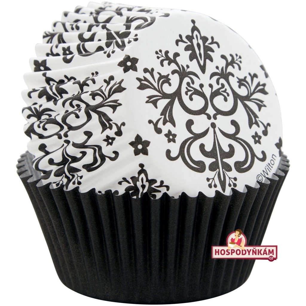 Černo-bílé papírové pečící košíčky jsou určeny k pečení muffinů. V balení se střídají košíčky s krajkovým motivem a černé.