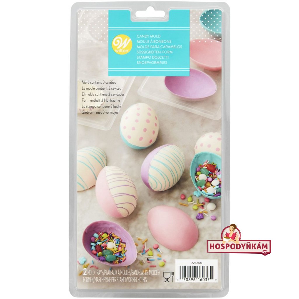 Plastová forma obsahuje 3 hluboké formy na půl vajíčka, ze kterých lze vyrobit čokoládovou dekoraci ve tvaru 3D velikonočního vejce, do kterého můžeme libovolně vložit další malé dobroty.