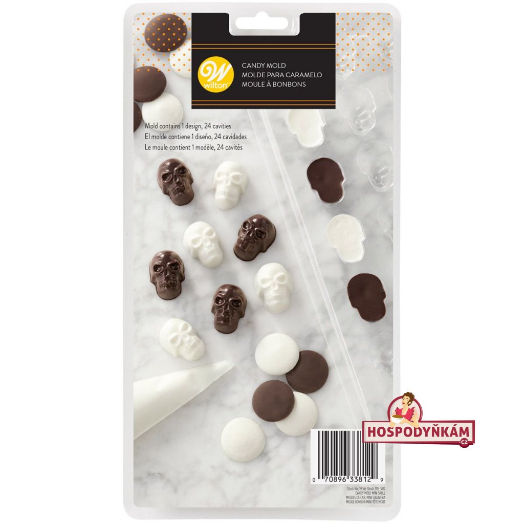 Plastová forma na přípravu 24 čokoládových pralinek ve tvaru lebky.