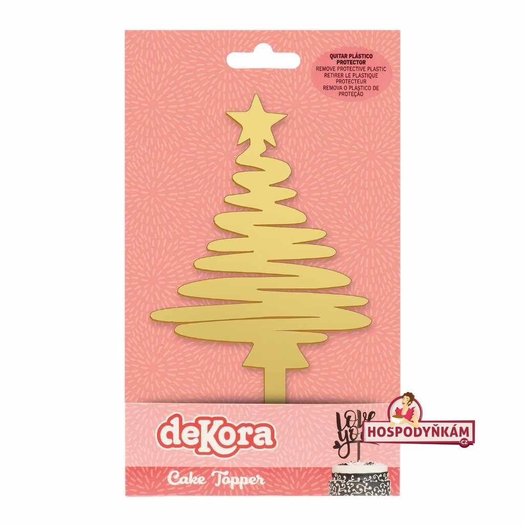 Elegantní plastový zápich ve tvaru zlatého vánočního stromečku s hvězdou na špičce je ideální dominantní ozdobou pro vaše vánoční nebo zimní dorty. Dekorace má rozměr 8 x 10 cm a délku zapichovací části 6,5 cm, díky čemuž krásně vynikne na každém slavnostním dezertu.